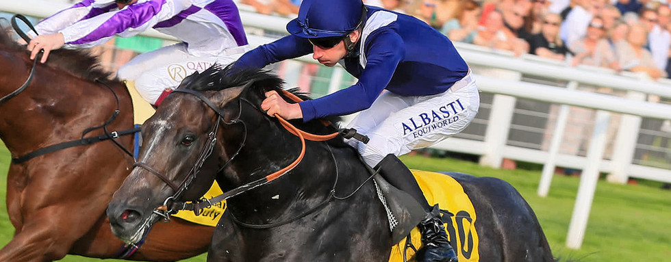 原屬中東馬主沙曼.卡里法酋長 (Isa Salman Al Khalifa) 名下,並由郭誠訓練,縱貫英、法、愛三國,11 戰共獲 2 冠 2 亞 4 季的「撼天鐵翼」(上圖),’21 年九月中,選取逆時針、左轉的英國紐百利,伙伯卻比,列陣只限兩歲馬角逐,直路 1200 米的水車礁石錦標 (二級賽),出閘迅捷,不過早段頗搶口,一度更見人馬角力,勉強扣於馬林中的三、四位,至 400 米柱左右放行、立見反應、逢馬過馬,最後 100 米內終於趕過領前的「侯王將相」 (Hierarchy),惟不出兩步,再被該駒反撲,門前「撼天鐵翼」僅以頭位,力保勝局,亦跟父系 Dark Angel 看齊,寫下同項錦標父子制霸的佳話。